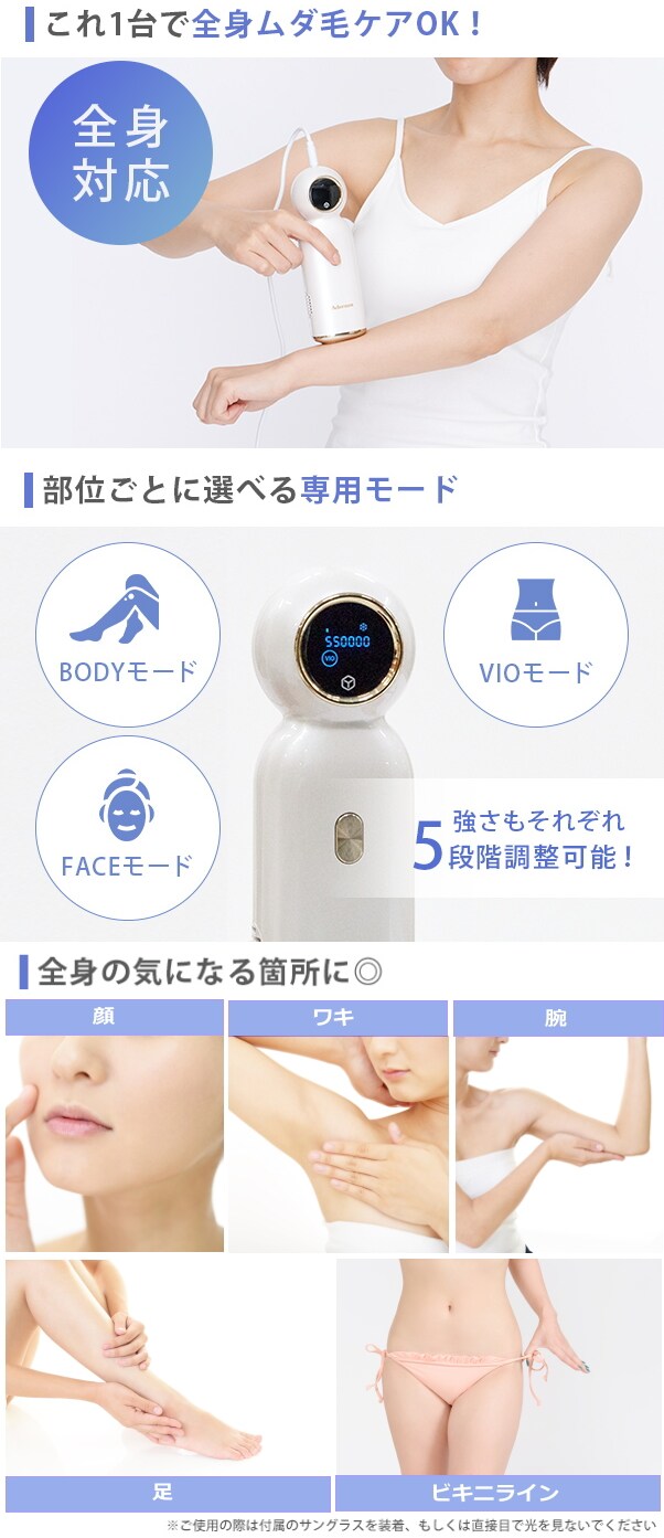 メラニン色素に反応するIPL技術を採用し、これ1台で、顔・ワキ・腕・足・背中・ビキニライン・VIOまで全身のムダ毛ケアOK!