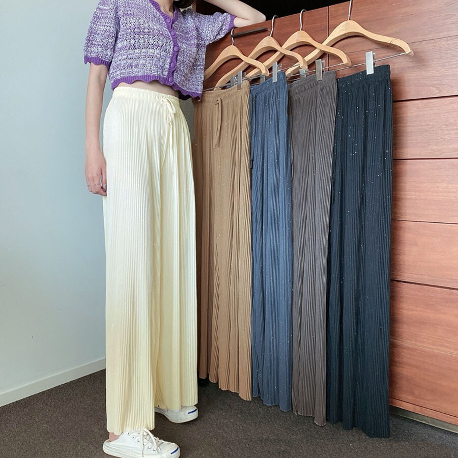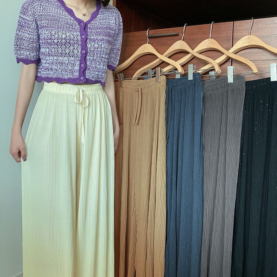 - 【ベージュ】ウエストゴム ラメプリーツワイドパンツ