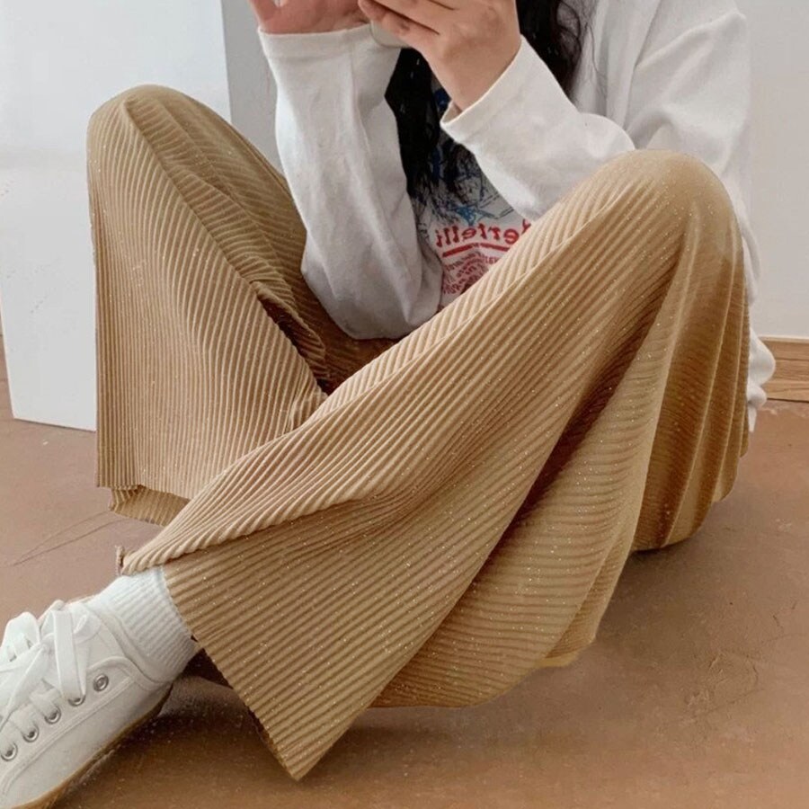 - 【カーキ】ウエストゴム ラメプリーツワイドパンツ
