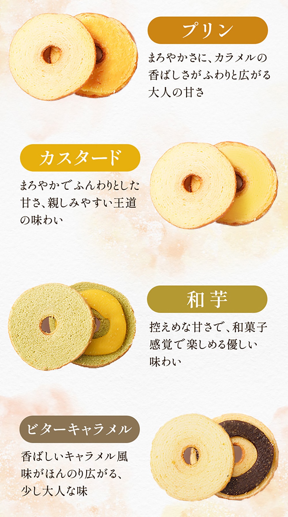 ビターキャラメル:キャラメルフラワーペースト(国内製造)、液卵、砂糖、小麦粉、マーガリン、コーンスターチ、オリゴ糖、牛乳、食塩/乳化剤、香料(一部に卵・乳成分・大豆を含む)
