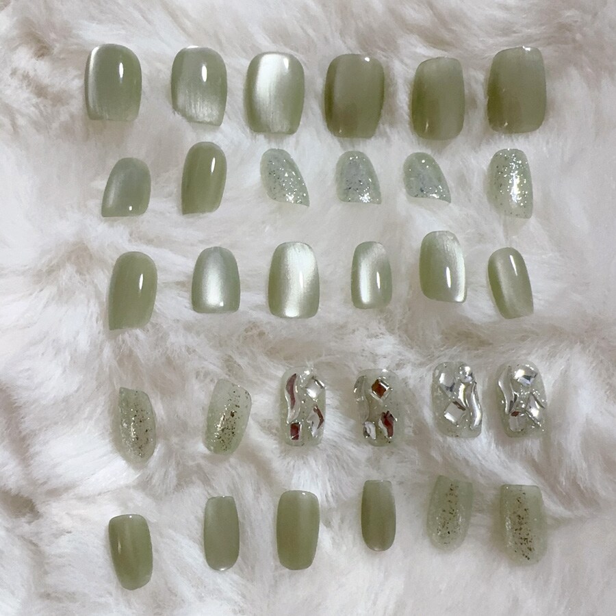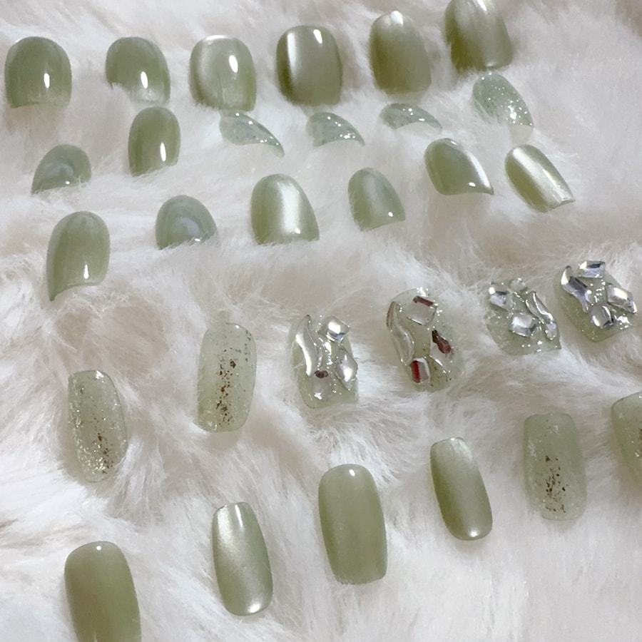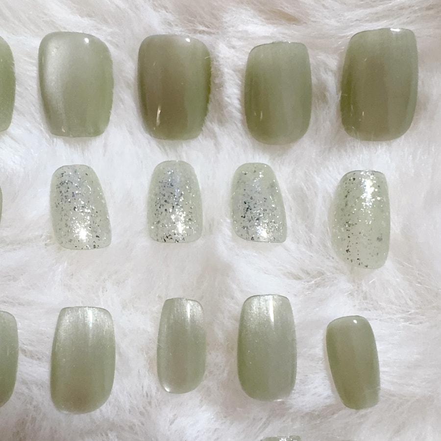 【30枚入】ネイルチップ グリーン×キラキラ | おとなっぽいカラーにキラキラのネイル