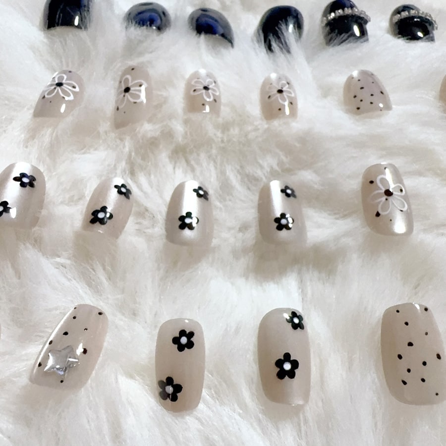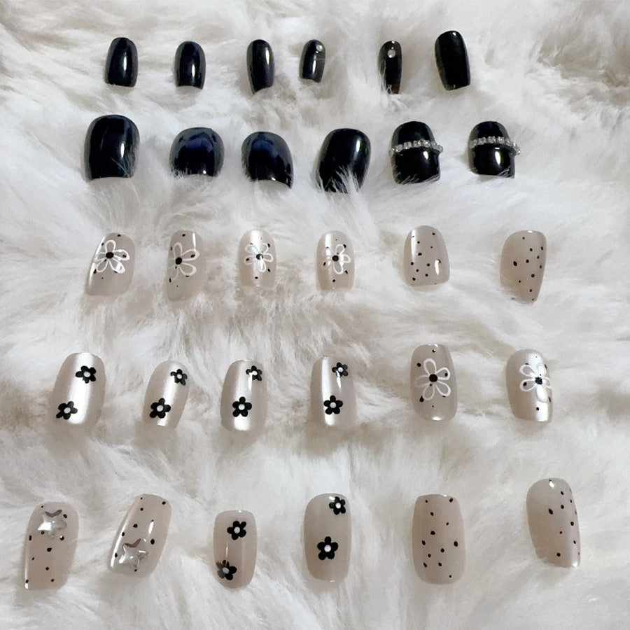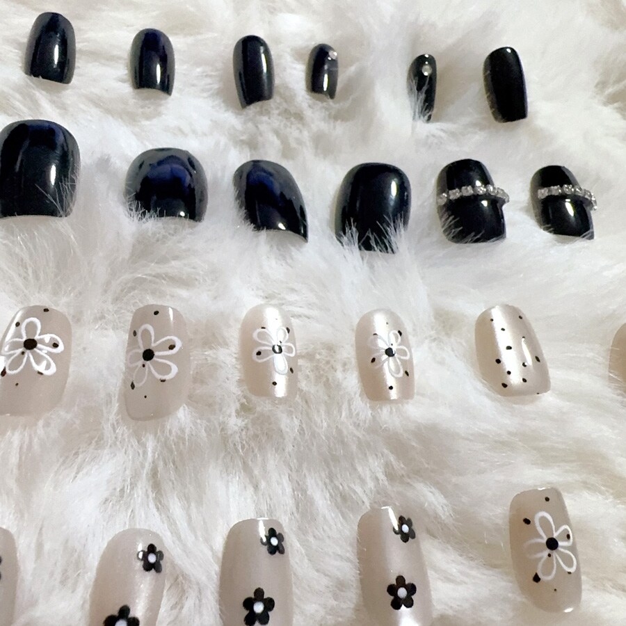【30枚入】ネイルチップ モノトーン風フラワーデザイン | シンプルなカラーにフラワーデザインがかわいいネイルチップ