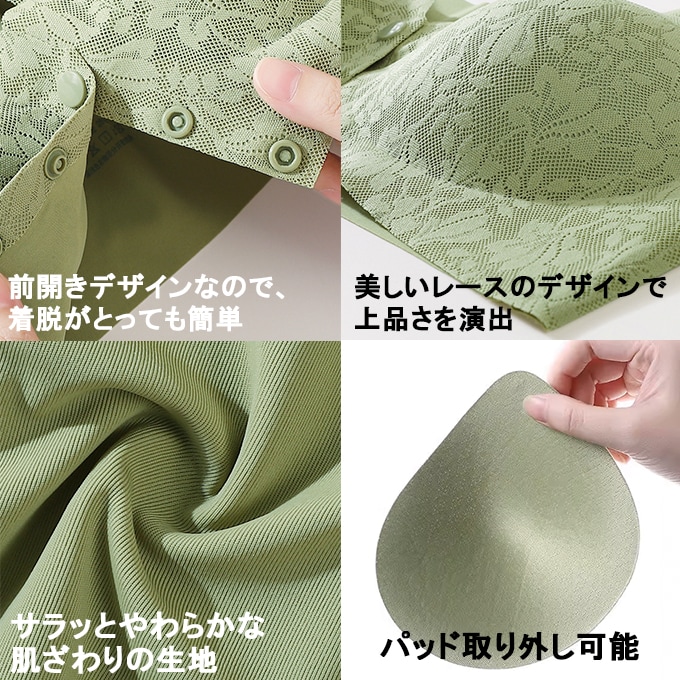 【Lサイズ/グリーン】前ボタンらくらくブラ | 上品なレースで魅せる!簡単着脱!寝る時も快適!