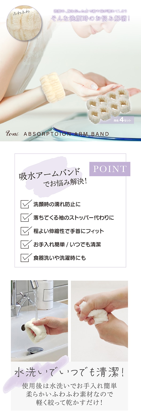 【アイボリー/4セット】吸水アームバンド | 洗顔中、腕を伝った水で袖や床が濡れてしまう。そんな洗顔時のお悩み解消