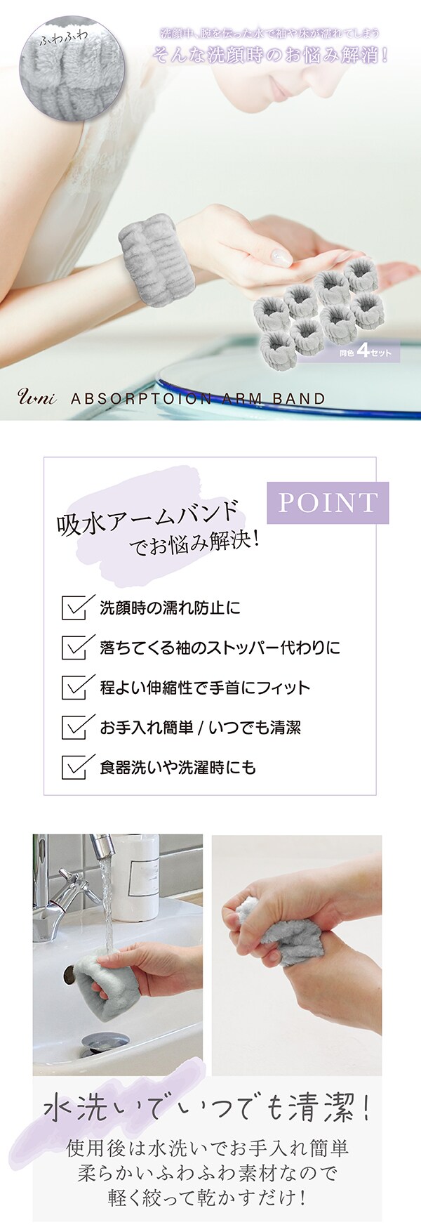 【グレー/4セット】吸水アームバンド | 洗顔中、腕を伝った水で袖や床が濡れてしまう。そんな洗顔時のお悩み解消