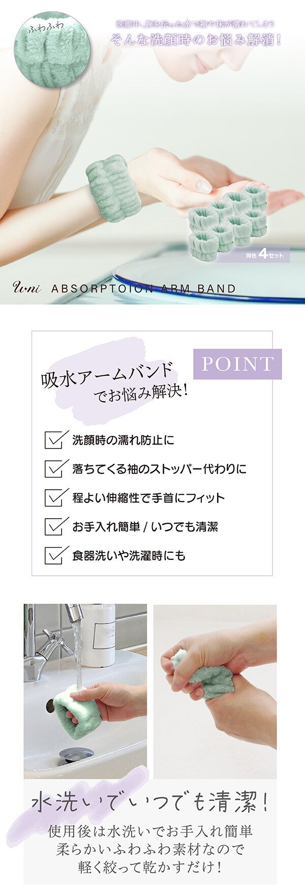 【ミント/4セット】吸水アームバンド | 洗顔中、腕を伝った水で袖や床が濡れてしまう。そんな洗顔時のお悩み解消