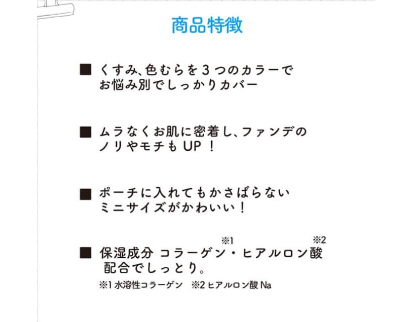 くすみ、色むらを3お悩み別に合わせたカラーでしっかりカバーします。ムラなくお肌に密着し、ファンデのノリや持続もアップします。ポーチに入れてもかさばらないミニサイズなので、ご自宅と外出用と持ち運びも便利です。