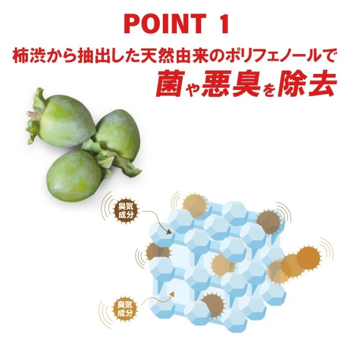 渋柿から抽出した天然由来のポリフェノールで菌や悪臭を除去。