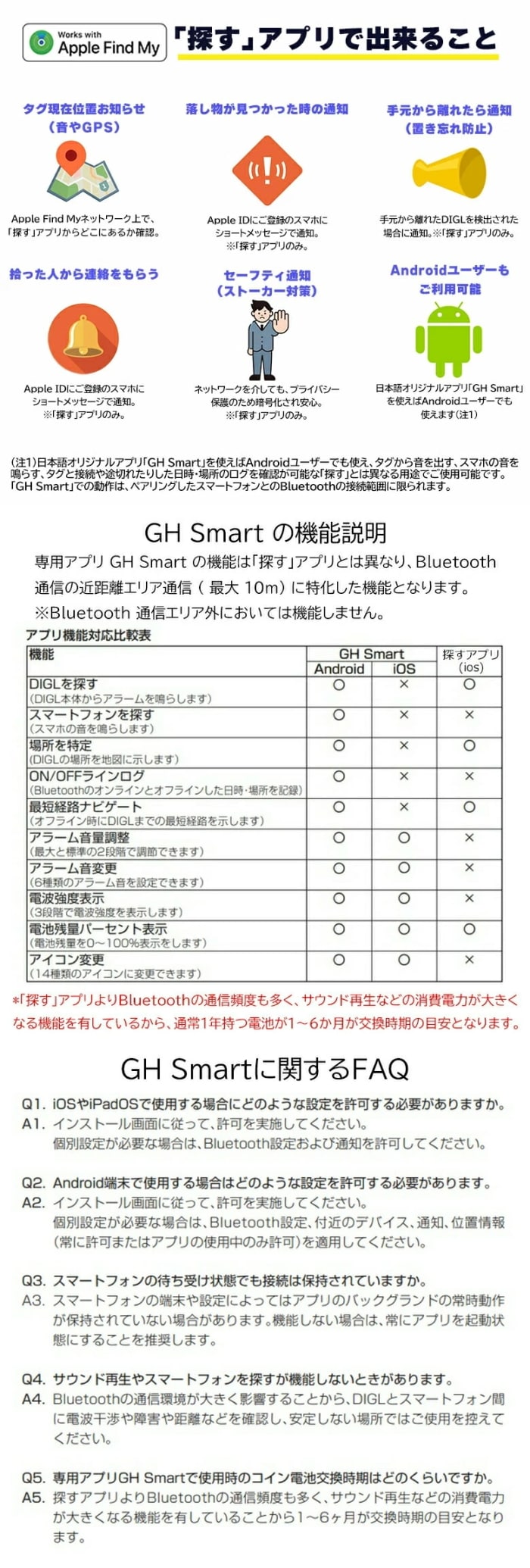 ・対応アプリ:探す(Apple社純正)、GH Smart(android機器、iOS機器)