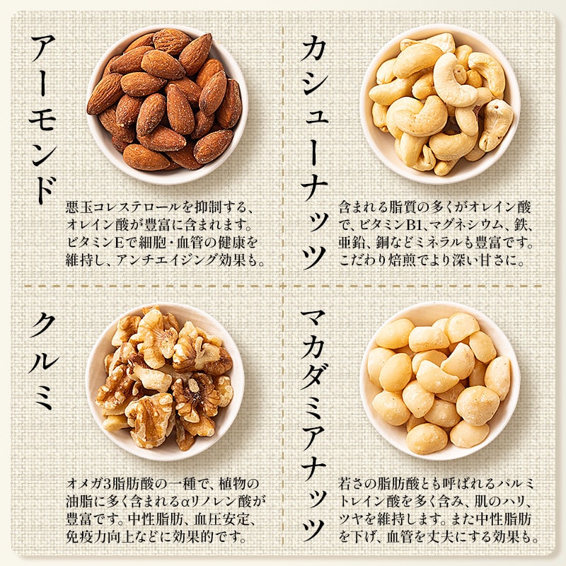 【原材料名】 アーモンド(アメリカ産)、カシューナッツ(インド産)、クルミ(アメリカ