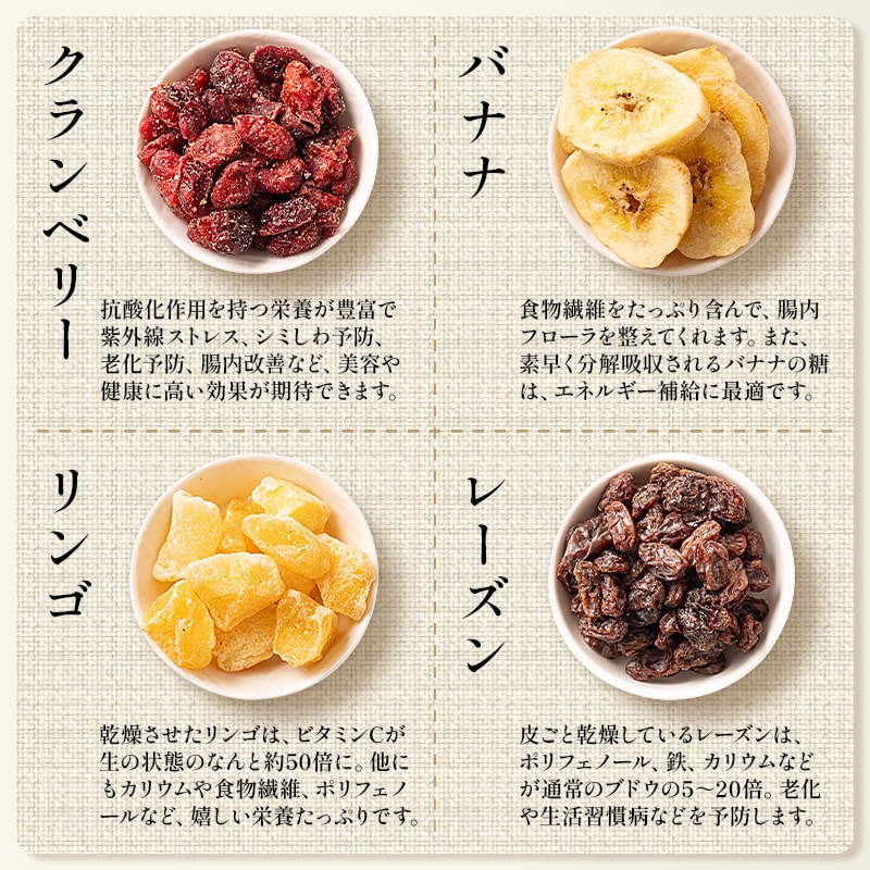 産、中国産)、バナナチップス(バナナ、ココナッツオイル、砂糖)、ドライクランベ