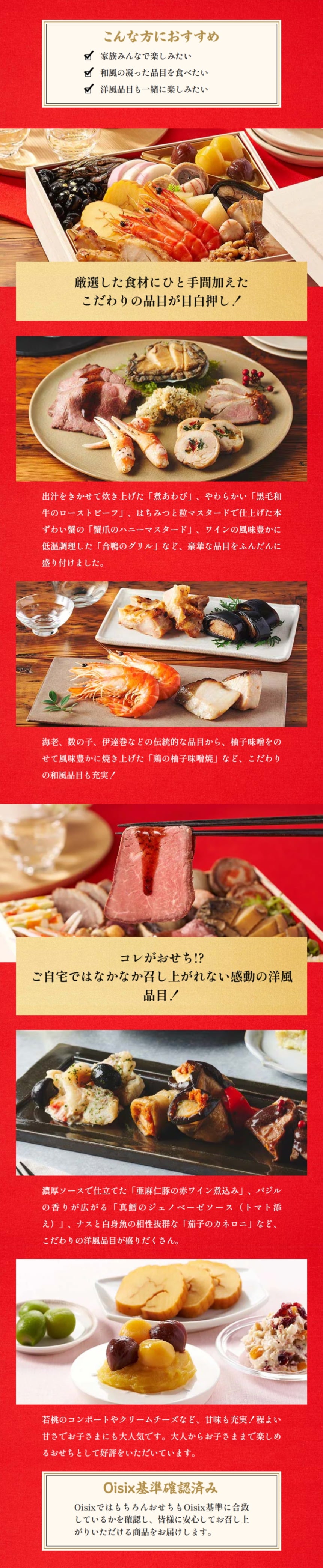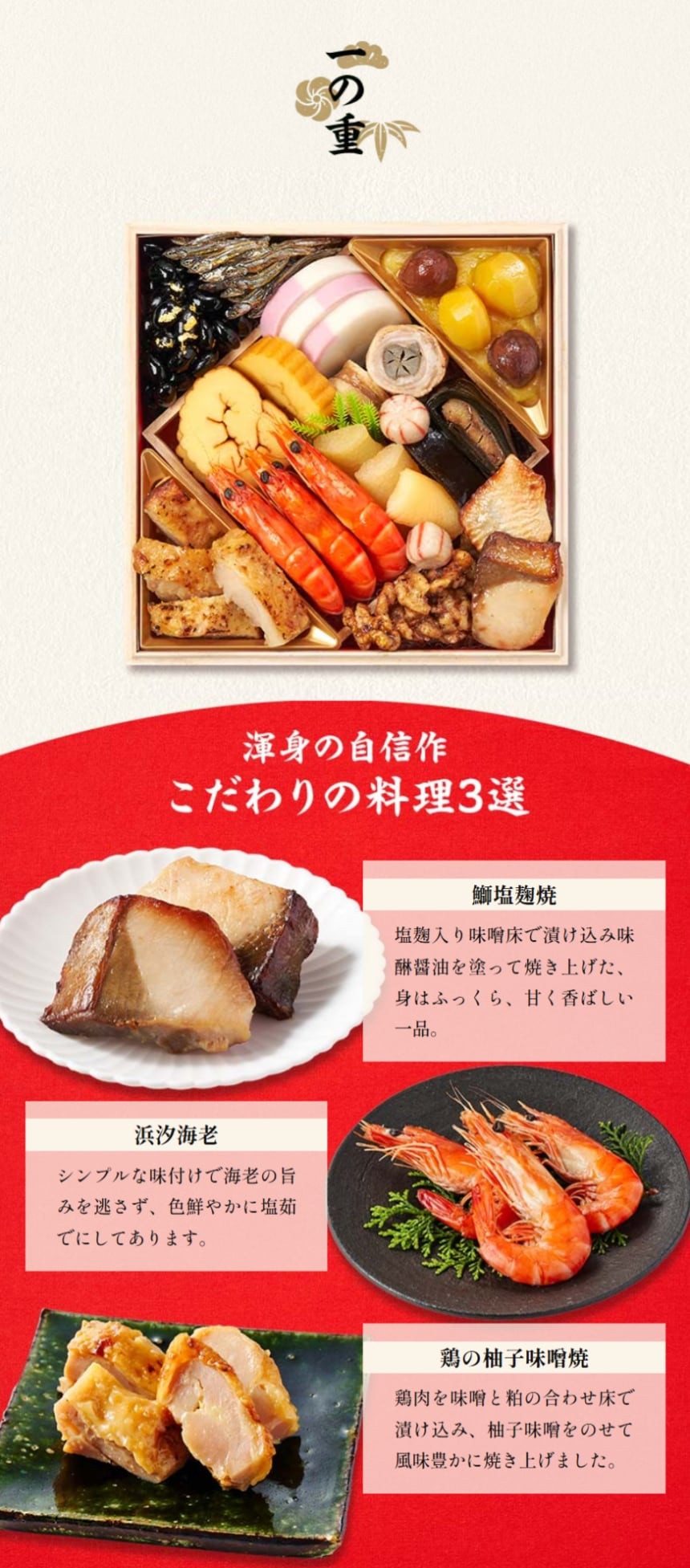 金箔黒豆,田作り,栗きんとん,鰤塩麹焼,かつをくるみ,鶏の柚子味噌焼,市松かまぼこ,豚八幡巻,手まり麩,鰊昆布巻,数の子美味漬,浜汐海老,伊達巻,パプリカのハーブマリネ,茄子のカネロニ,若桃のコンポート レモン風味,アマダイのデュクセルソース,キャロットラペ,チキンサラメ,帆立のアメリケーヌソース,ほうれん草のバターソテー,亜麻仁豚の赤ワイン煮込み,赤魚のムニエル レモンバタークリーム,クリームチーズ クランベリーのせ,真鱈のジェノベーゼソース(トマト添え),野菜とレンズ豆の味噌チーズ,合鴨のグリル ブラウンソース添え,ミックスビーンズのソテー,海老しいたけ,裏白しいたけ,牛巻き鶏挽肉射込み,蟹爪のハニーマスタード,松笠いかとわかめのカクテルソース和え,黒毛和牛のローストビーフ(ソース付),煮あわび,鶏と彩り野菜の包み焼,琥珀ふくさ包み,ブーレットのチーズ焼,小鯛の香草パン粉焼