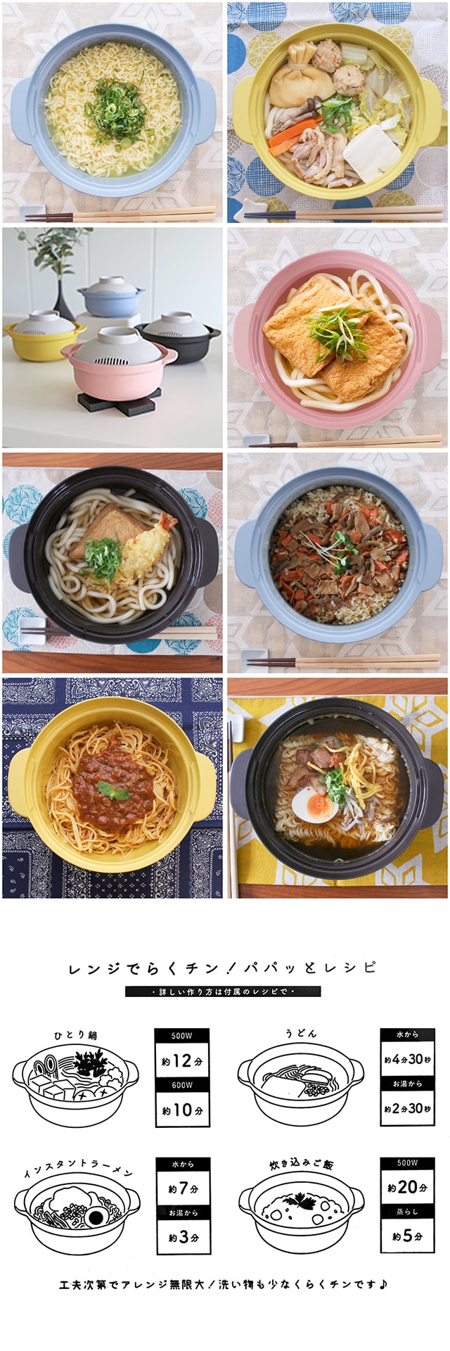 レンジで手軽に調理が出来るレンジ用コンパクトサイズのお鍋。一人暮らしの方や料理が苦手な方でも、材料を入れてチンするだけで簡単にお料理が作れます。簡単レシピ付