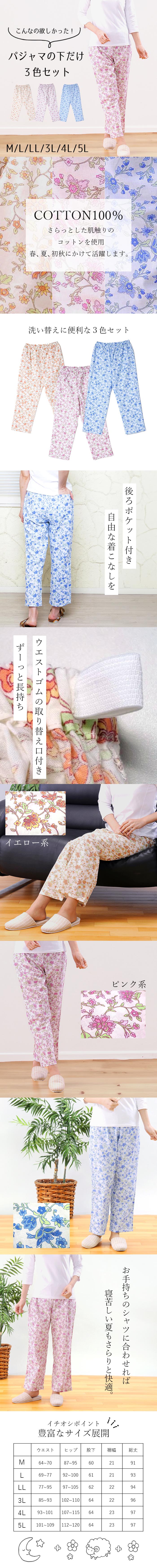 【3Lサイズ/3色組】サイズ豊富なパジャマの下 | ★天然素材綿の優しい風合いのパジャマ下!
