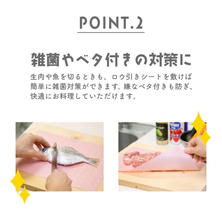 まな板に敷く事で気になるお肉や魚のベトつきやニオイ移りを防いで衛生的にご使用頂けます。