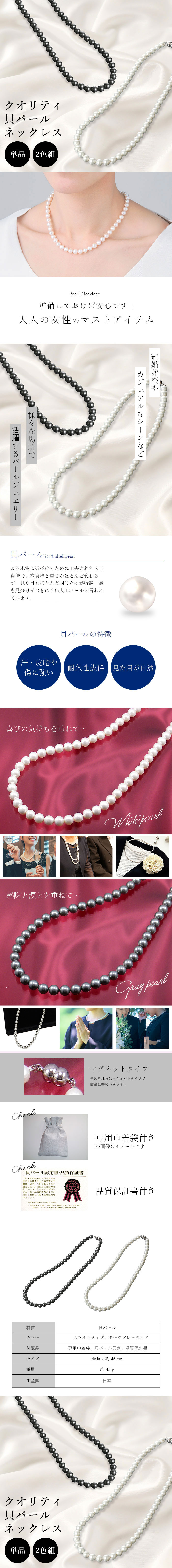 【2色セット】クオリティ貝パールネックレス (ホワイト/ダークグレー) | ★準備しておけば安心です!色々なシーンで活躍してくれる貝パールのネックレス。