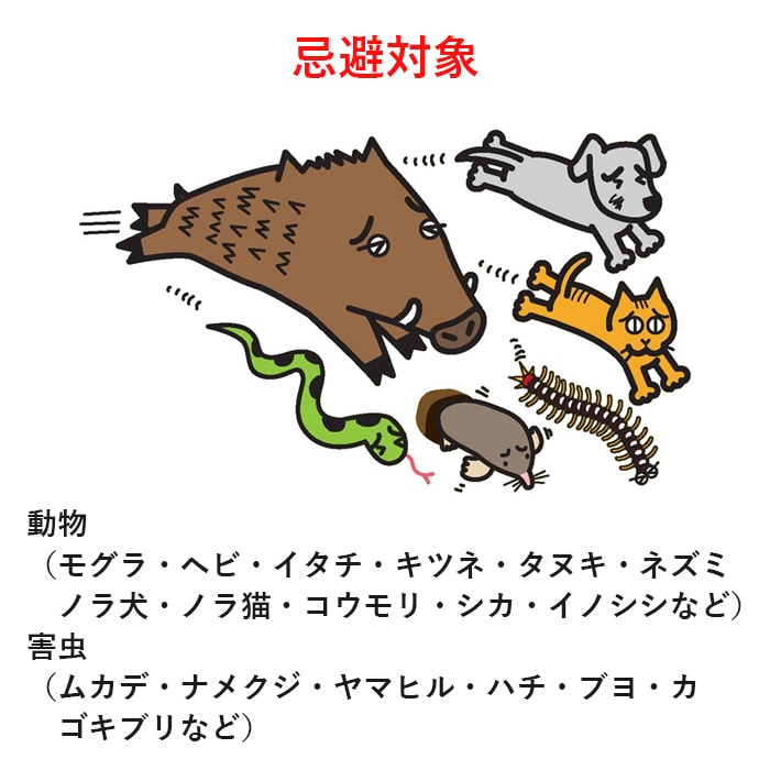 忌避対象:動物(モグラ・ヘビ・イタチ・キツネ・タヌキ・ネズミ・ノラ犬・ノラ猫・コウモリ・シカ・イノシシなど)害虫(ムカデ・ナメクジ・ヤマヒル・ハチ・ブヨ・カ・ゴキブリ・ボウフラなど)