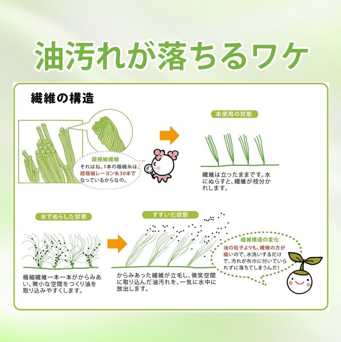 *ほこり、チリ、髪の毛だけでなく、「油汚れ」が水だけで見事に落ちる魔法の効果。
