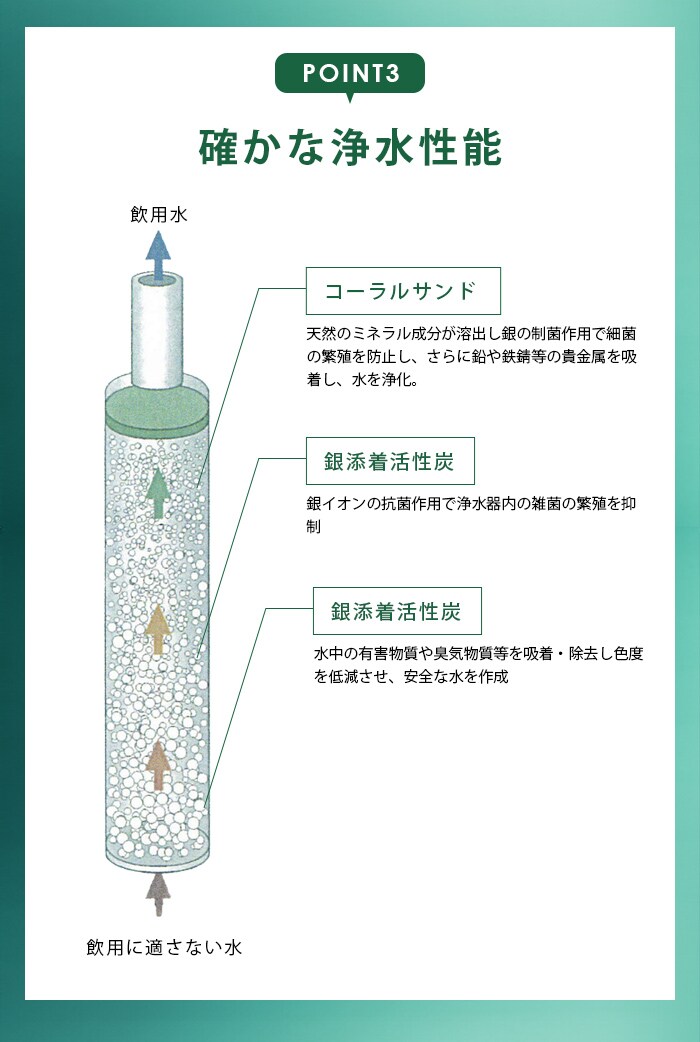 (2)川や池・プール・お風呂の残り水、又外国の水などを飲む場合、容器に入れ、付属の粉末除菌剤で除菌してから、(1)の方法で飲んでください。