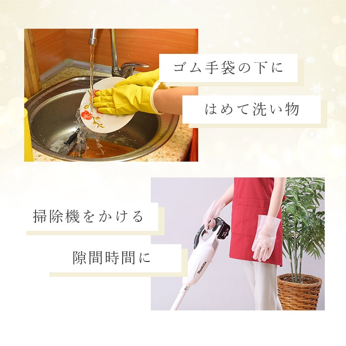 *手の荒れやすい洗い物時も、ゴム手袋の下に着用すれば、いい感じ・・・・!