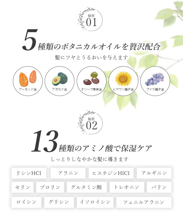*13種の保湿アミノ酸成分を贅沢に配合、しっとりしなやかな髪に導きます。