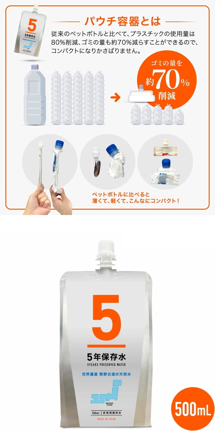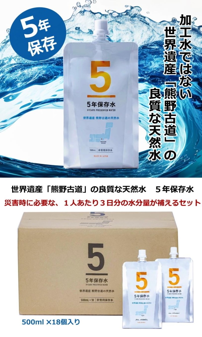 【500ml×18個】5年保存水 パウチ ウォーター<非常用保存水> | 世界遺産「熊野古道」紀州熊野山系の天然水を使用した非常時用5年保存水!