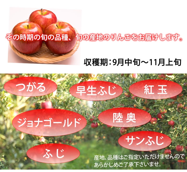 発送時期により「つがる」「早生ふじ」「ジョナゴールド」「サンふじ」「ふじ」「紅玉」「陸奥」