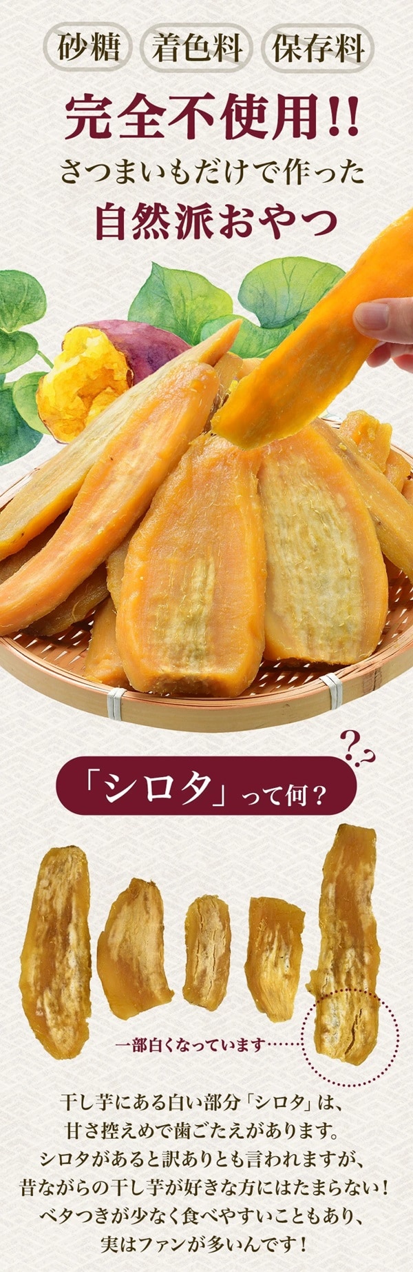 干し芋にある白い部分「シロタ」は、甘さ控えめで歯ごたえがあります。シロタがあると規格外品とも言われますが、昔ながらの干し芋が好きな方にはたまらない! ベタつきが少なく食べやすいこともあり、実はファンが多いんです!