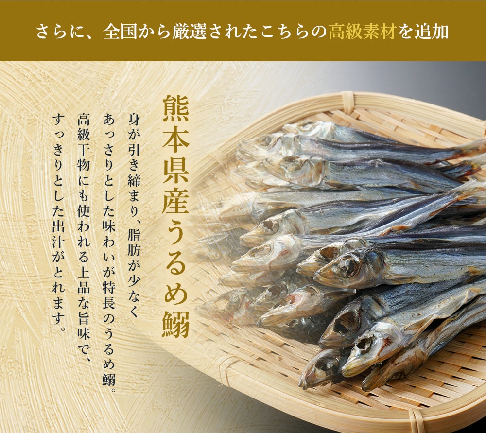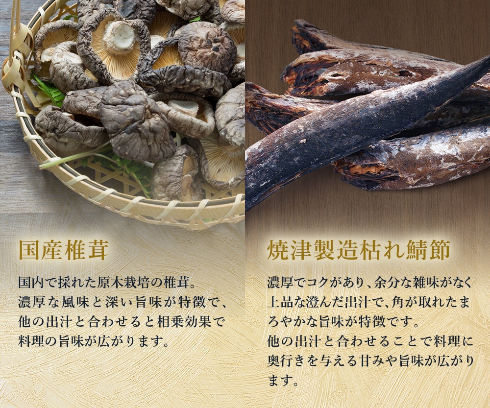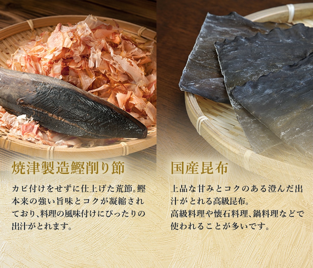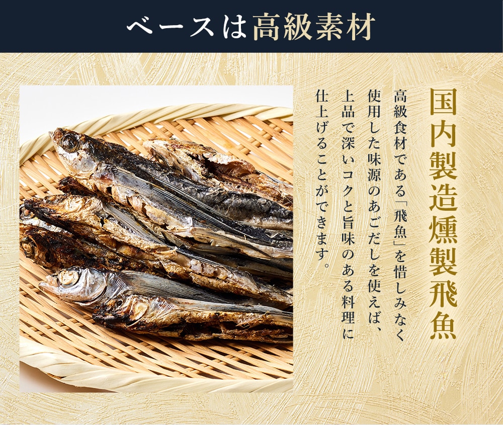 食塩(国内製造)、砂糖、飛魚粉末、煮干うるめ鰯粉末、鰹削り節粉末、粉末しょうゆ、鯖節粉末、酵母エキス、昆布粒、椎茸粉末、食用植物油脂/調味料(アミノ酸等)、(一部に小麦・さば・大豆を含む)