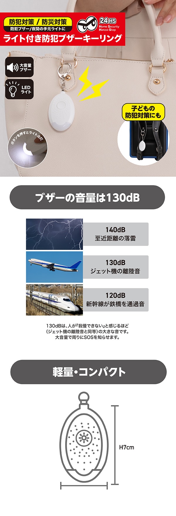 【ホワイト】ライト付き防犯ブザーキーリング | いざという時に!安心ブザーキーリング 防犯、防災対策
