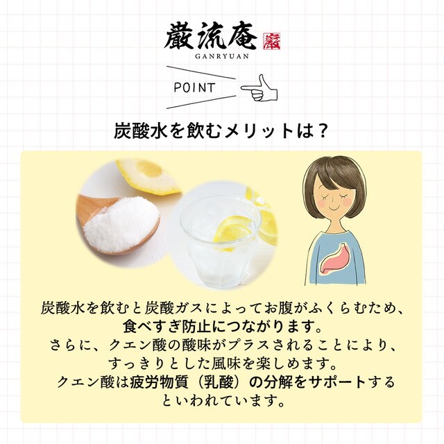炭酸水を飲むと炭酸ガスによってお腹がふくれるため、食べすぎ防止につながります。さらに、クエン酸の酸味がプラスされることにより、すっきりとした風味を楽しめます。区クエン酸は疲労物質(乳酸)の分解をサポートするといわれています。