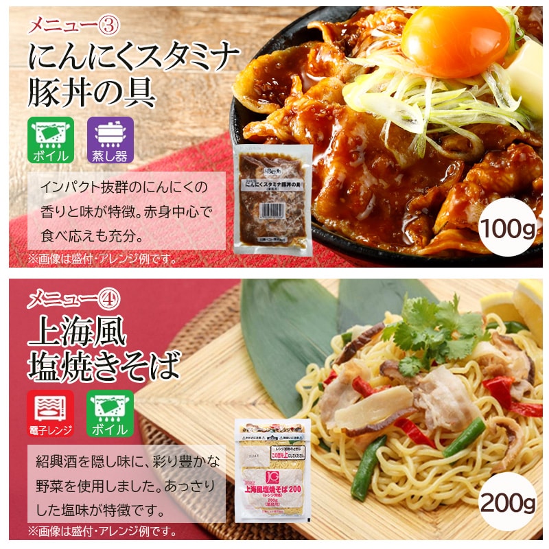 牛丼の素、ハンバーグ、焼きそばなど人気の商品をセットにしました。