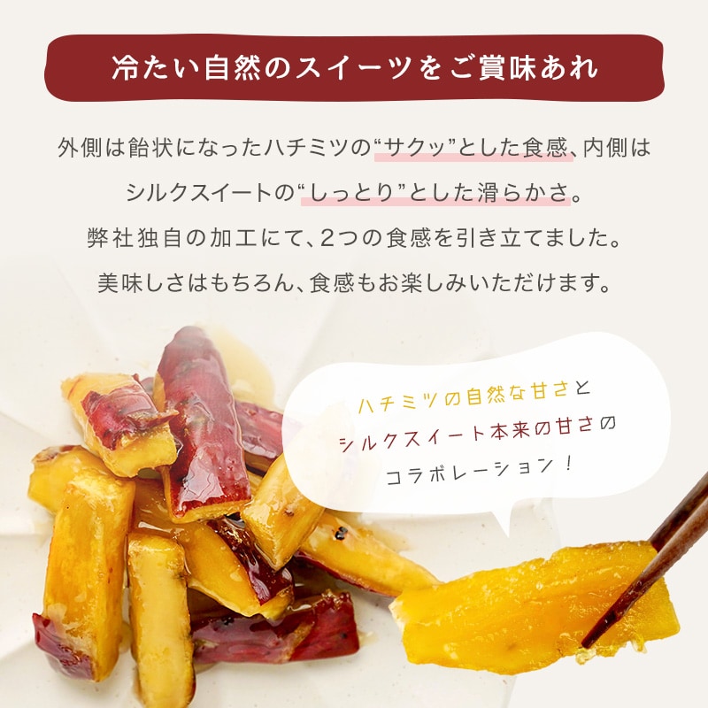 サクッとお芋棒は弊社独自の加工にて、やわらかい食感と甘さを引き立てました。先ずは食感をお楽しみ下さい。外側の飴状のサクッとした食感と内側はシルクスィート本来の絹の様な滑らかさは絶品に値します。是非冷たい自然のスィーツをお楽しみ下さい