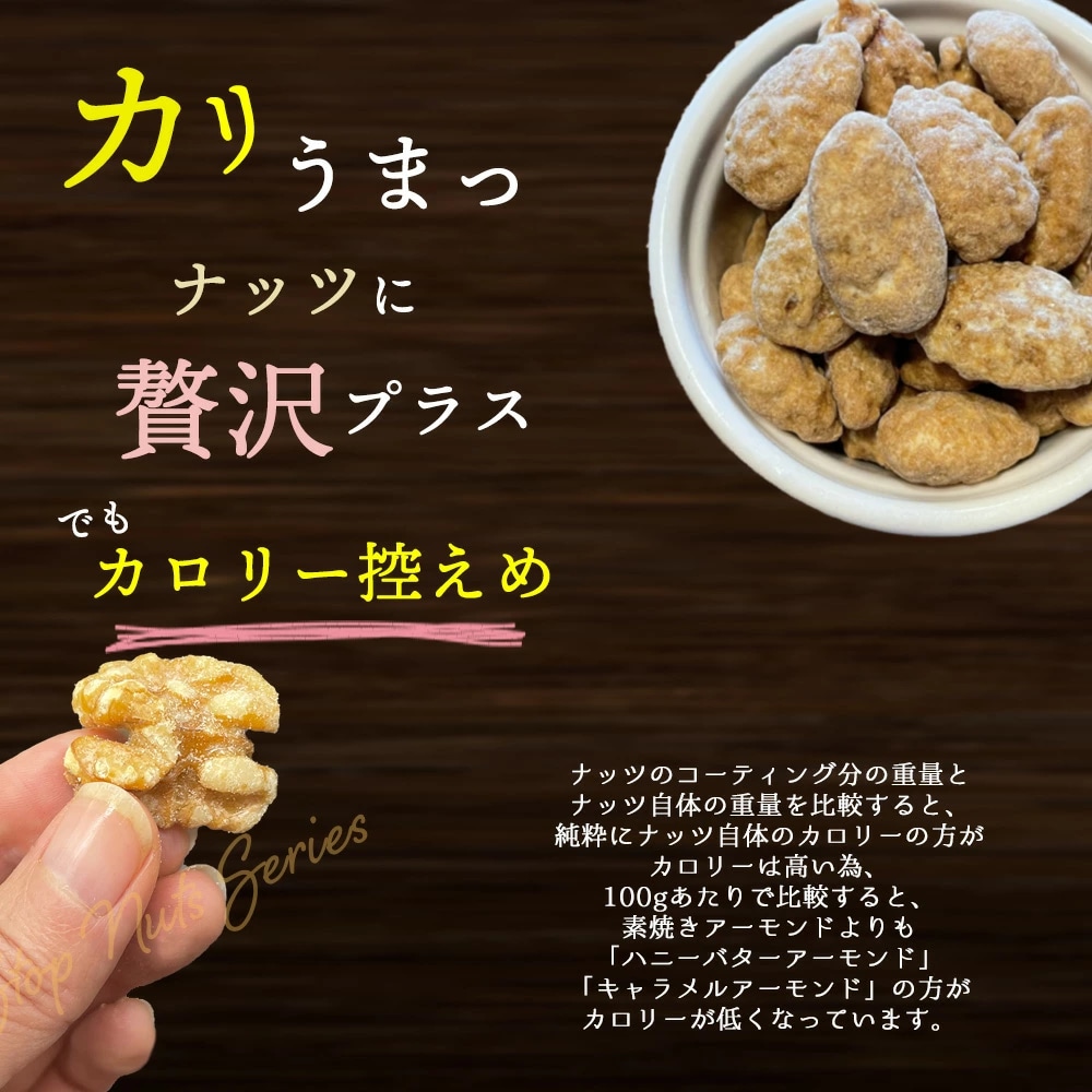 ストップナッツシリーズのハニーバターアーモンド!いつものナッツが贅沢な甘さに。しかも、同じ重量で比較すると、素焼きアーモンドよりカロリーが低い。栄養豊富なのにカロリー控えめ。おやつやおつまみ、栄養補給に、ぜひお試しください。