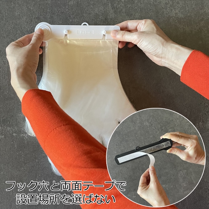 吊り下げフック穴と貼り付け両面テープのどちらでも設置できるので設置場所を選びません。