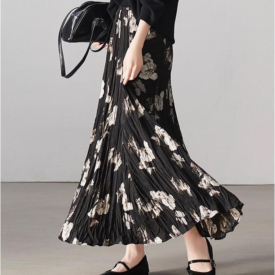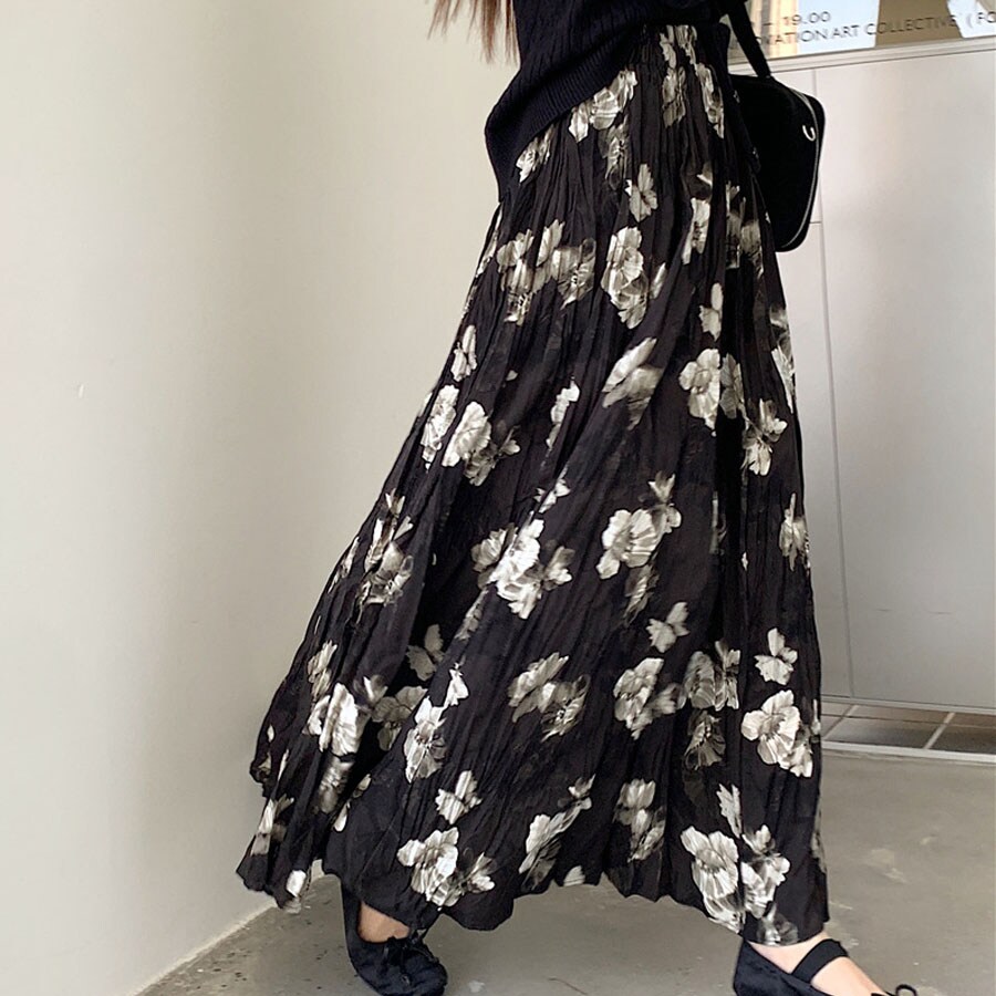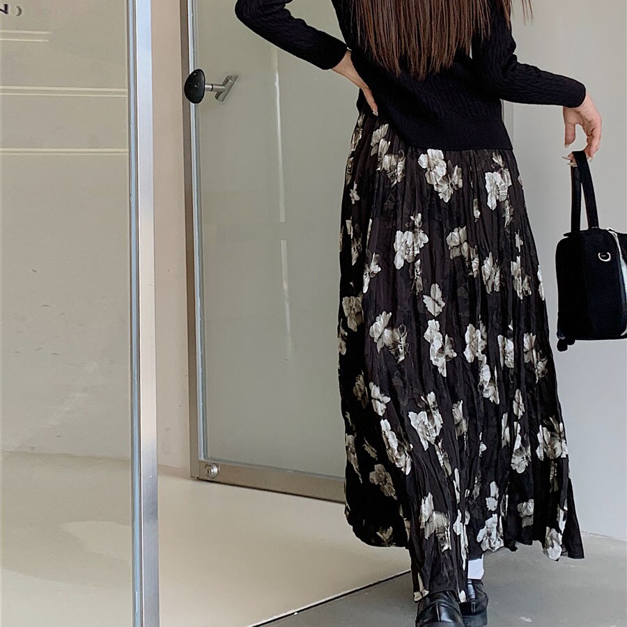 【ブラック】花柄 ロングフレアスカート | 花柄デザインで大人っぽい印象のスカート ウエスト部分がゴム仕様で楽ちんスタイル