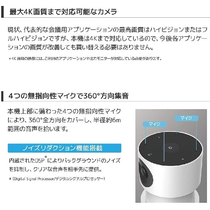 ●マイク/指向性:無指向性アレイマイク4個、周波数範囲:100-10kHz、感度:-29dBFs、集音範囲:約6m