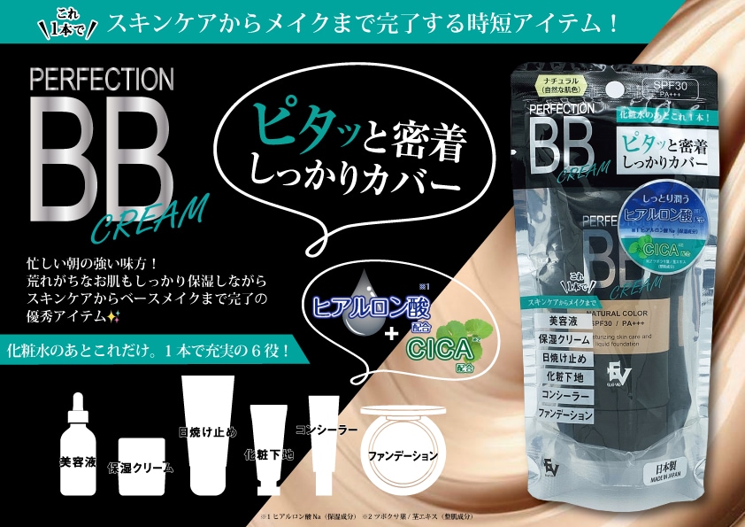 1本でスキンケアからメイクまで完了する時短商品のBBクリームに、話題のCICA(ツボクサ葉/茎エキス)を配合。