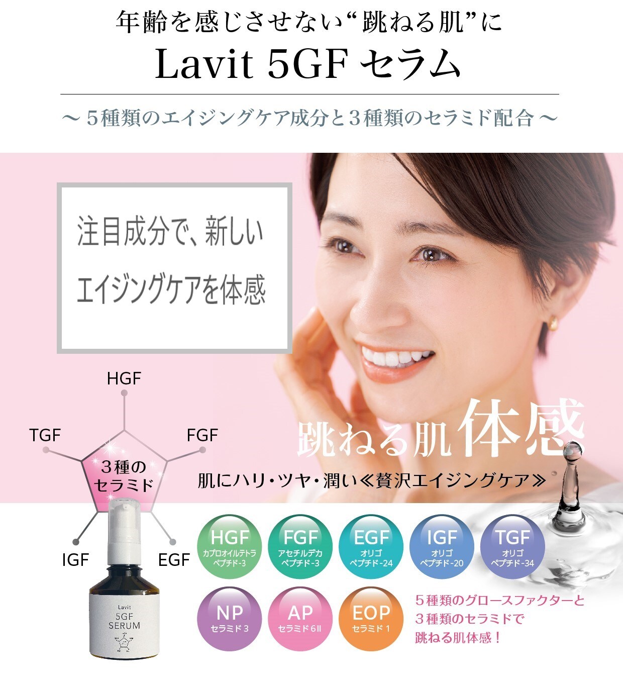「5GFセラム」水、BG、グリセリン、ベンチレングリコール、グリコシルトレハロース、加水分解水添デンプン、ジグリセリン、PEG-60水添ヒマシ油、キサンタンガム、カルボマー、グリチルリチン酸2K、水酸化K、アルガニアスピノサ核油、アセチルヒアルロン酸Na、ヒアルロン酸Na、加水分解ヒアルロン酸、ペルミチン酸レチノール、コーン油、ベタイン、加水分解コラーゲン、ラウロイルラクチレートNa、PCA-Na、乳酸Na、PCA、セリン、アラニン、セラミドNP、スギナエキス、ホップエキス、セイヨウアカマツ球果エキス、レモン果実エキス、ローズマリー葉エキス、グリシン、セラミドAP、フィトスフィンゴシン、コレステロール、トコフェロール、グルタミン酸、リシンHCI、トレオニン、アルギニン、アーチチョーク葉エキス、オリゴペプチドー34、プロリン、オリゴペプチドー24、オリゴペプチドー20、アセチルデカペプチドー3、デキストラン、カプロオイルテトラペプチドー3、セラミドEOP、フェノキシエタノール
