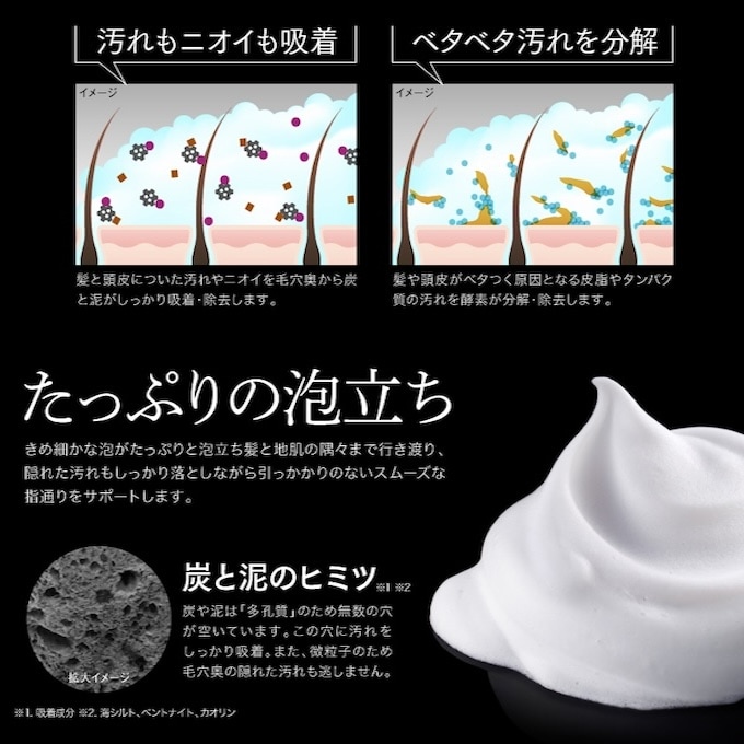 水、オレフィン(C14-16)スルホン酸Na、コカミドプロピルベタイン、BG、コカミドDEA、ヤシ油脂肪酸PEG-7グリセリル、ココイルグリシンK、リパーゼ、スブチリシン、アミラーゼ、炭、シクロデキストリン、加水分解コラーゲン、カオリン、海シルト、ベントナイト、アルガニアスピノサ核油、加水分解ケラチン、PCA、スクワラン、グリセリン、オリーブ種子油、カニナバラ果実油、ポリソルベート20、カプリル酸グリセリル、1.2-ヘキサンジオール、カプリリルグリコール、ポリクオタニウム-10、フェノキシエタノール、クエン酸、香料