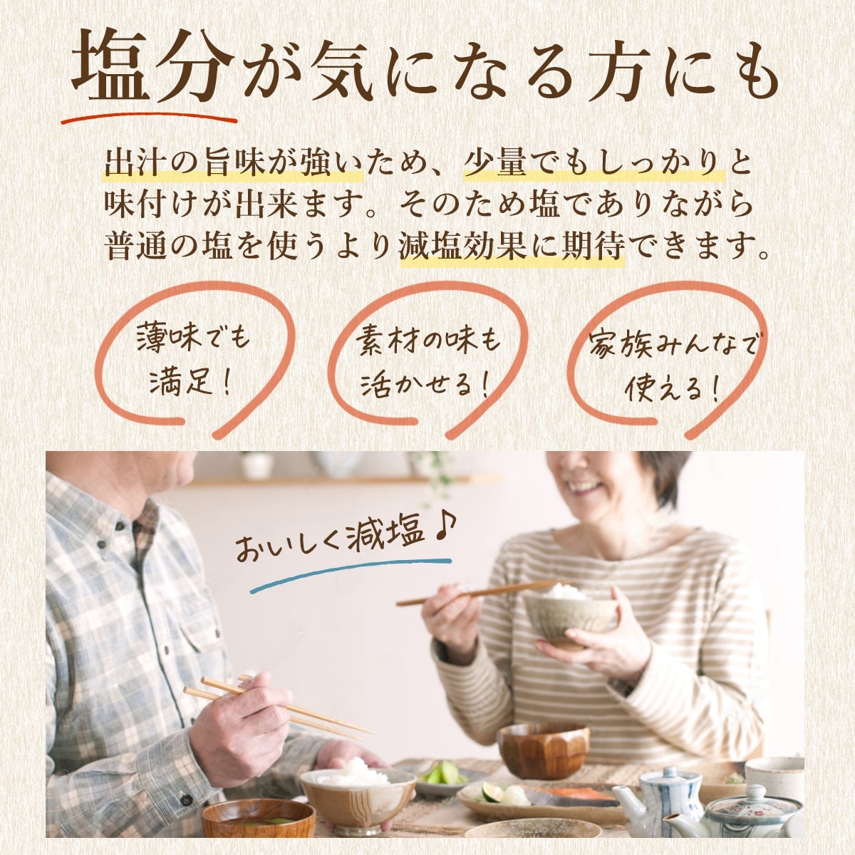 天ぷらのつけ塩(しお)、お吸い物やスープ、炊き込みご飯、パスタ、チャーハン、卵焼き、和え物、サラダ、焼き魚にも。子供のごはんにも使いやすいまろやかで、ふりかけ感覚の出汁塩です。