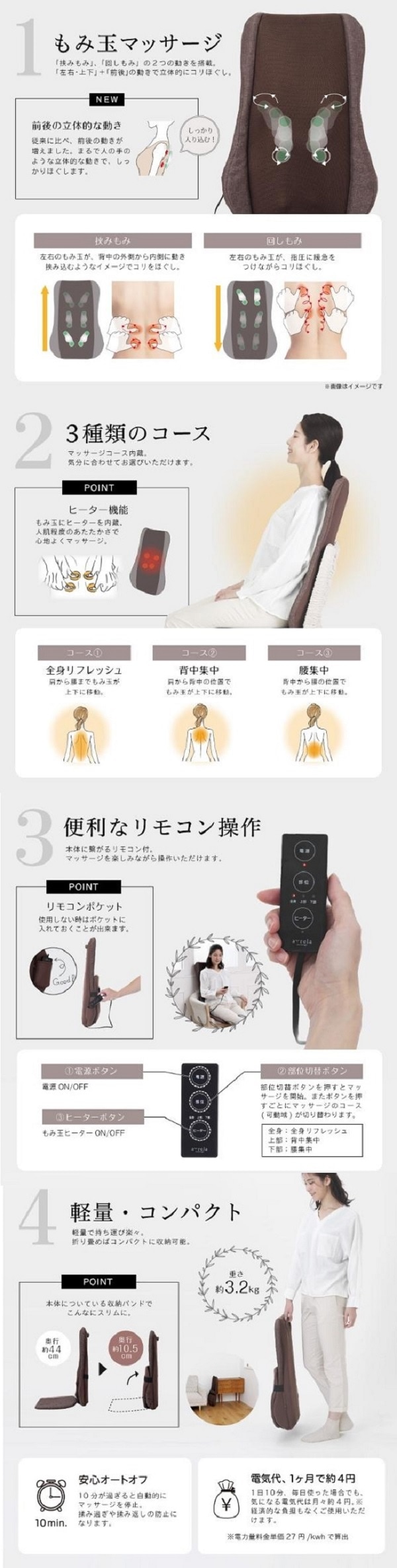 左右の指圧に緩急をつけながらコリをほぐす「回しもみ」の2つの動きを搭載しています。
