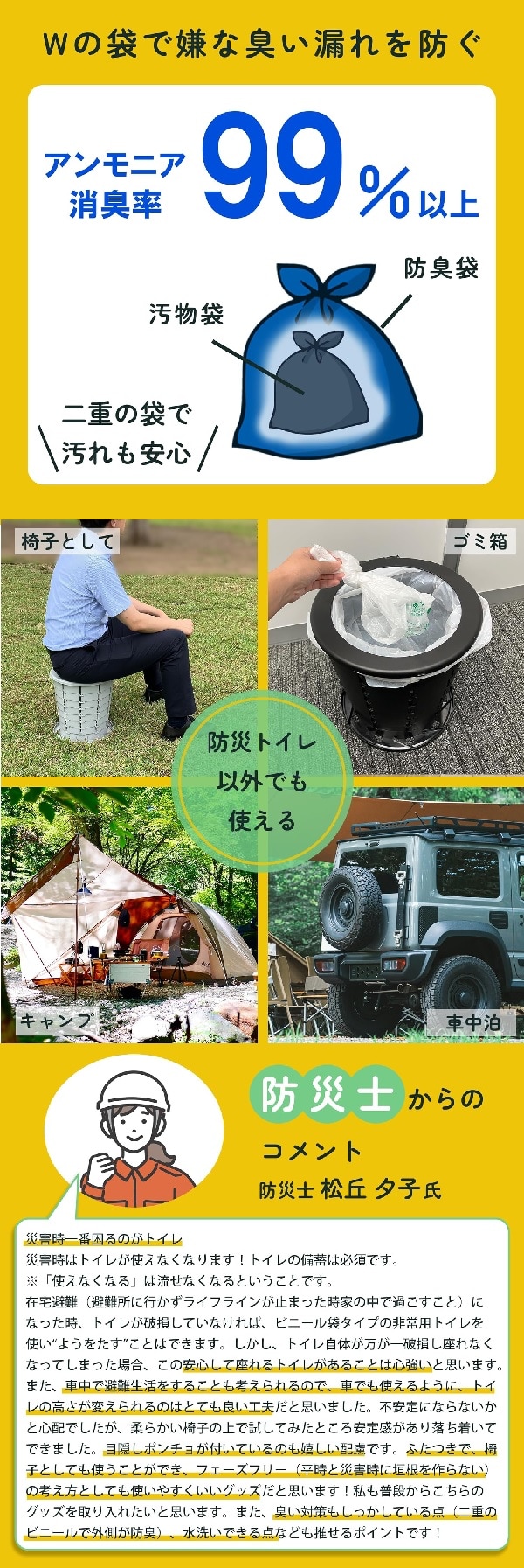 汚物袋、防臭袋、凝固剤が付属しており、目隠しポンチョは防災用の断熱仕様です。