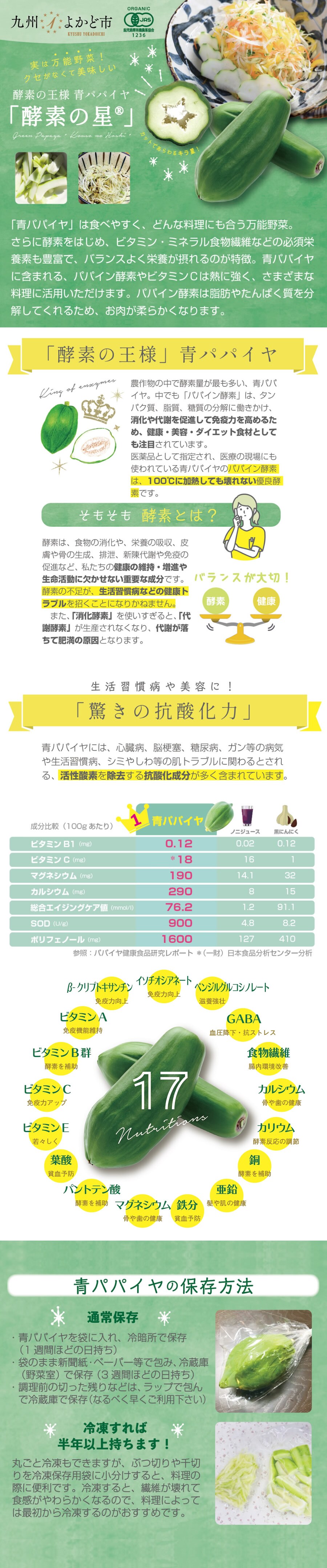 青パパイヤは、一般的な黄色いフルーツパパイヤと違い、野菜として栽培・収穫する品種のパパイヤで、その実と葉には豊富な栄養素と酵素が含まれており、理想の健康・美容食材と言われています。「酵素の星®」は鹿児島県鹿屋市の自社有機農場で栽培しているブランド青パパイヤです。名前に「星」と付いているのは、輪切りにしたとき、中が星の形になるからです。くせのない味なので、いろんな料理に合わせられてとっても便利ですし、熱に影響を受けないパパイン酵素なので、加熱した料理でも栄養はそのまま。有機青パパイヤ「酵素の星®」を、ぜひ毎日の美容・健康生活にお役立てください。