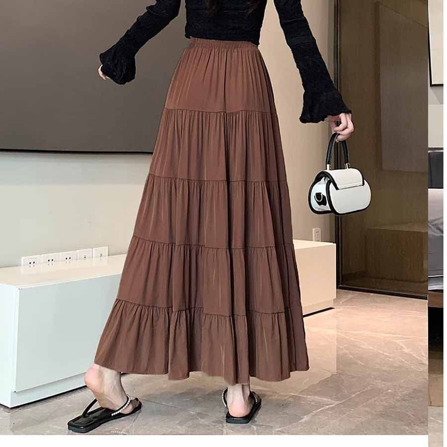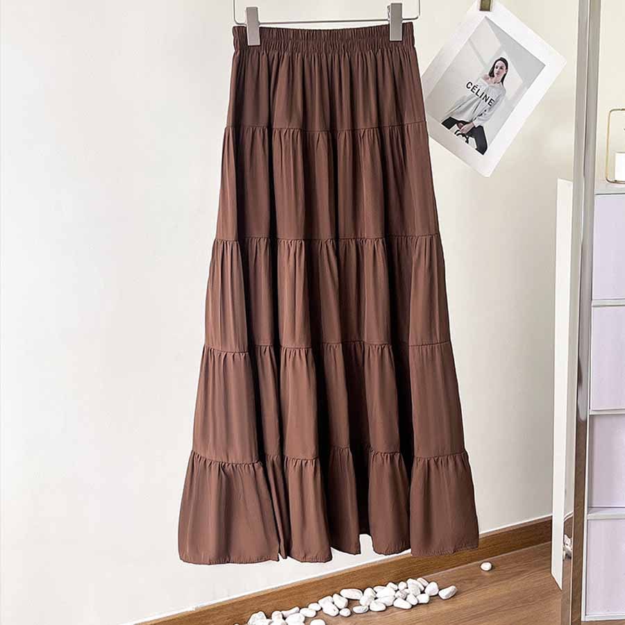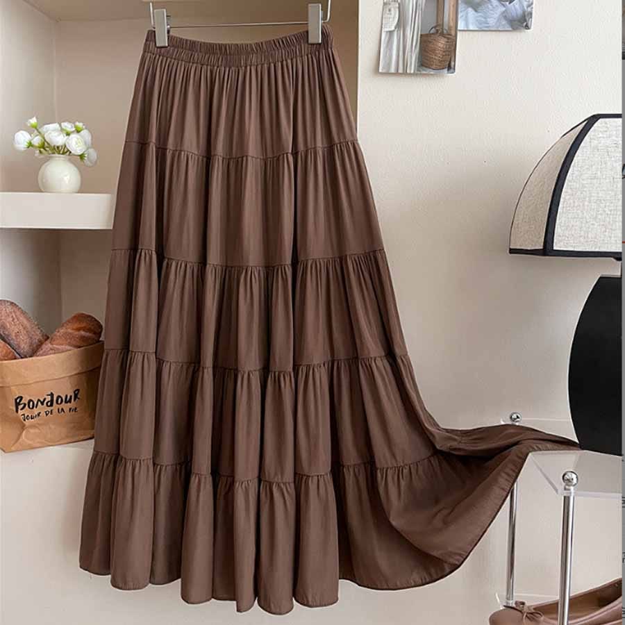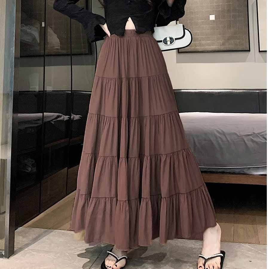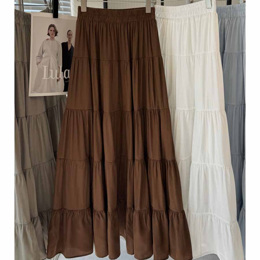 【ブラウン】マキシ丈 ティアードスカート | フレアデザインで上品なウエストゴムスカート