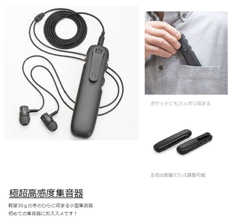 軽量35gで手のひらに収まるイヤホンタイプの小型集音器です。