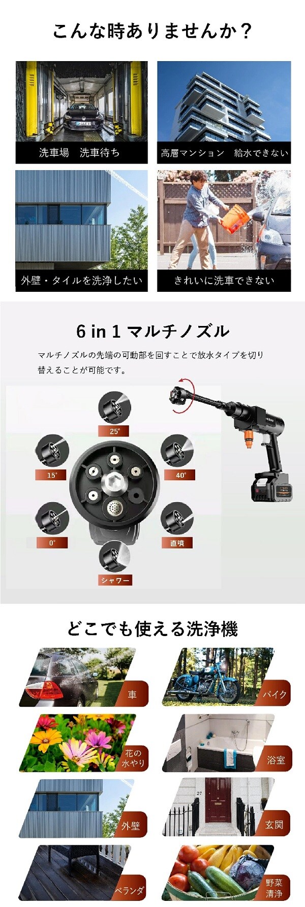 - 本体/ACアダプター/フィルター/クイックコネクター/バッテリー/洗剤ボトル/給水ホース(5m)/6in1マルチノズル/取扱説明書/収納ケース