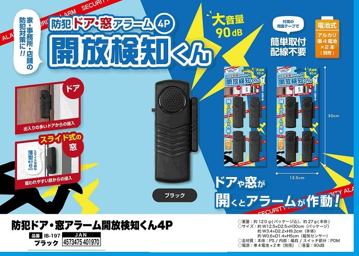 - 防犯ドア・窓アラーム 開放検知くん4P IB-197 ブラック