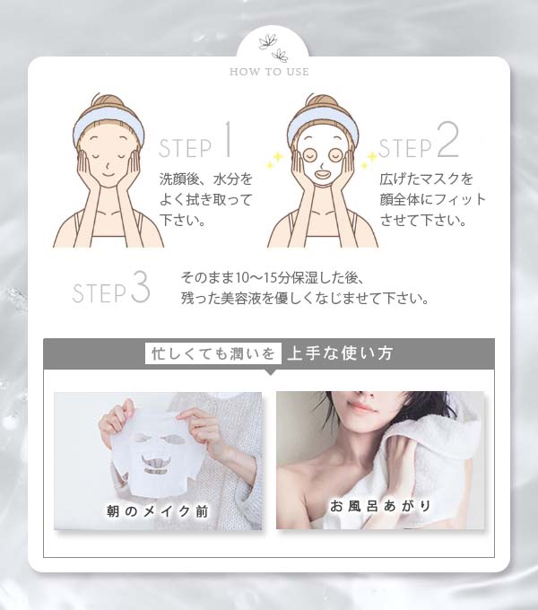(3) 5から10分を目安にやさしくはがし、お肌に残った美容液は手のひらになじませてください。