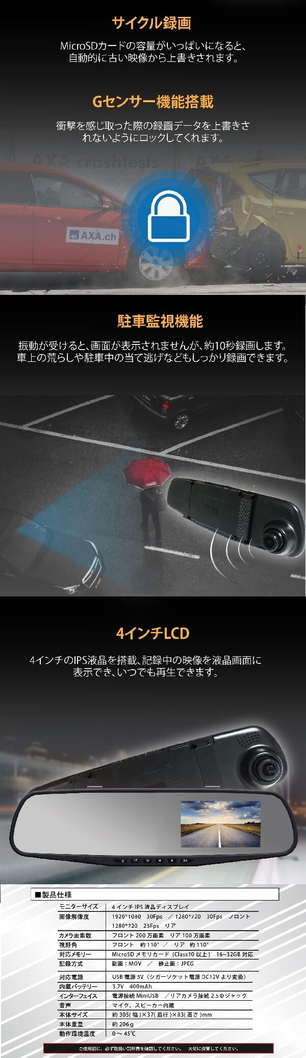 フロントカメラは200万画素、 リアカメラは100万画素と同時に撮影ができるミラー型ドライブレコーダです。